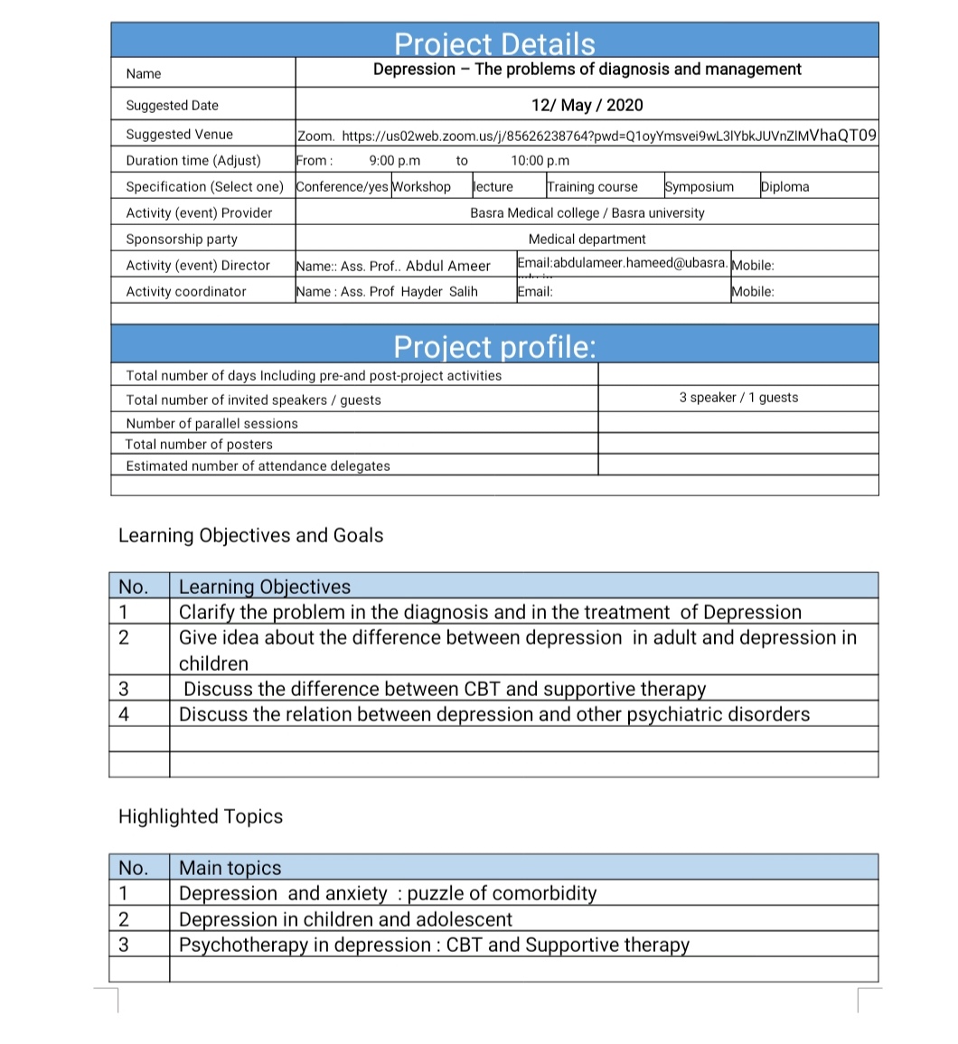 أقام فرع الطب الباطني في كلية الطب جامعة البصرة وبرعاية السيد رئيس جامعة البصرة الاستاذ الدكتور سعد شاهين حمادي المحترم وبإشراف السيد عميد كلية الطب الاستاذ الدكتورخليل اسماعيل الحمدي المحترم ندوة علمية افتراضية عن مشاكل تشخيص وعلاج مرض باستخدام تطبيق zoom. وضحت الندوة المشاكل والعقبات التي يواجهها الاطباء في تشخيص مرض الكآبة واعطت فكرة عن الفرق بين مرض الكآبة عند البالغين عنه عند الاطفال والفرق بين العلاج المعرفي السلوكي والعلاج الداعم لمرضى الكآبة. كما ناقشت العلاقة بين مرض الكآبة والامراض العقلية الاخرى.