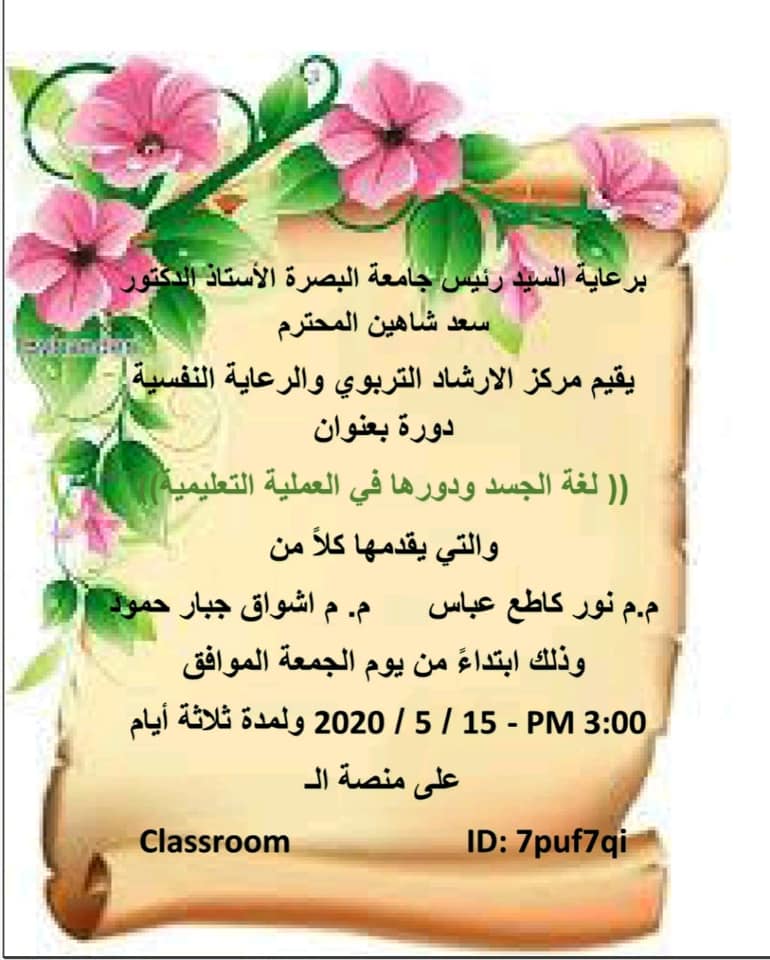 مركز الارشاد التربوي والرعاية النفسية في جامعة البصرة يدعوكم لحضور الدورة الالكترونية عن لغة الجسد و دورها في العملية التعليمية