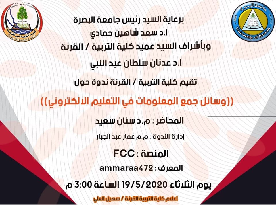 كلية التربية القرنة في جامعة البصرة تستعد لاقامة ندوة عن بعد حول وسائل جمع المعلومات في التعليم الالكتروني